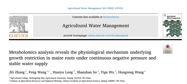 近日,买球赛的app官网农学院资环系王鹏教授指导的2019级博士生张吉立以第一作者,王鹏教授为通讯作者在国际农林科学与灌溉科学领域顶级期刊《Agricultural Water Management》(中科院一区期刊)发表了题为《Metabolomics analysis reveals the physiological mechanism underlying growth restriction in maize roots under continuous negative pressure and stable water supply》的研究论文(https://doi.org/10.1016/j.agwat.2021.107452)。本研究得到了国家重点研究开发项目(2018YFE0112300)的资助。