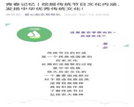 2021年1月25日--2月5日,为引导青年学生进一步了解传统节日,认同传统文化、传承传统文化,农学荣光队严格按照国家以及所在地疫情防控要求,在做好防护的基础上线上线下进行社会实践。农学荣光队于黑龙江省齐齐哈尔市甘南县,开展了线上线下相结合寒假“三下乡”活动。