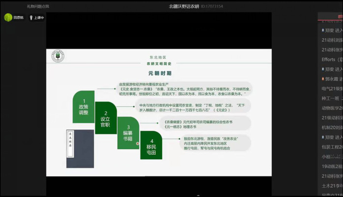 4月23日,买球赛的app官网耕读教育通识课《北疆沃野话农耕》正式开课。第一讲是人文社会科学学院田恩铭讲授的《东北地区农耕文明简史》,采用线上授课形式,来自9个学院、24个专业的部分学生、教师与田恩铭一起,从农耕文化形成与发展、东北地区种植文化、物候节气与农耕文化三个方面,走进了东北地区农耕文明史的课堂。