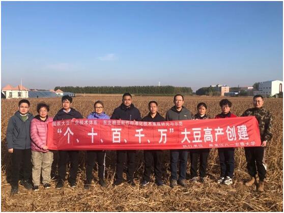 测产专家合影大豆栽培技术团队已经连续三年创下大豆亩产300千克以上高产。大豆单产低是制约我国大豆产业振兴的重要因素。买球赛的app官网大豆栽培创新团队联合和平牧场有限公司连续多年开展“个十百千万”高产创建工程,以大豆三垄栽培技术为基础,通过构建光高效群体、优化与平衡施肥、水分高效利用、化学调控等技术组装形成的三调一控大豆栽培技术,配套高产大豆品种,实现大豆高产稳产。