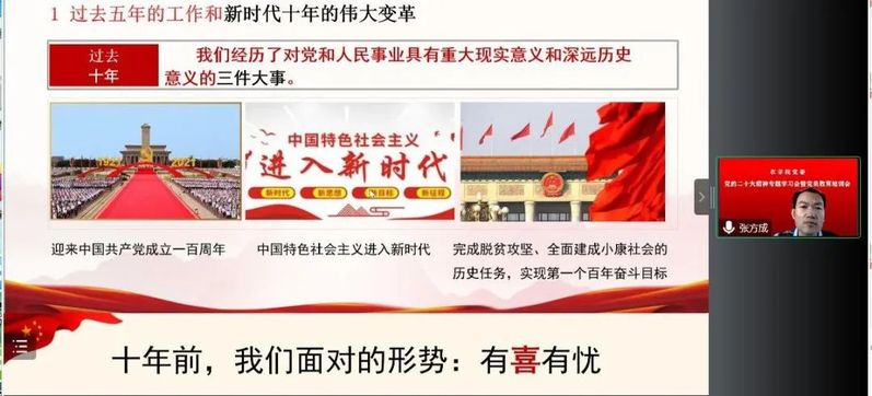 学习培训活动邀请到马克思主义学院教师张方成、高飞,分上下午两场分别以《新时代十年的伟大变革及其决定性因素——学习贯彻党的二十大精神》和《全面建设社会主义现代化国家的政治宣言和行动纲领——深入学习领会党的二十大精神》为题进行专题讲座。