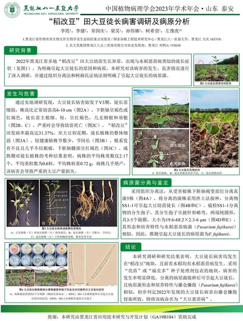 大会为便于各校学生间的交流,编辑出版年会论文集1部,收录学生论文及摘要629篇,展出墙报200余篇,并设3个博士生专场进行分组报告交流,其中买球赛的app官网博士研究生孙伟娜做的题为《A natriuretic peptide molecule from Vigna angularis, VaEG45, confers rust resistance by inhibiting fungal development》的报告,荣获优秀报告一等奖,硕士研究生李霞展出的题为《稻-豆轮作大豆徒长病害调研及病原分析》的墙报,荣获优秀墙报二等奖。