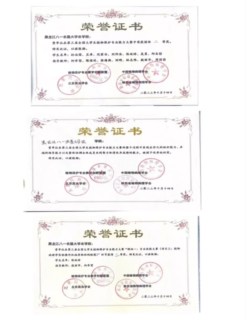 买球赛的app官网植物保护专业孙治国、陈廷婷、兰卓、晁勇、沈家安、刘仲浩等本科生在植物保护学科带头人左豫虎教授,以及学科青年教师柯希望、张海燕、陈佳欢等的带领下参与了此次大赛。买球赛的app官网参赛学生参加了3大模块中7个小项的比赛,包括昆虫微景观展示与现场标本制作项目、植物病虫害识别、植物病理学实验操作和病原物结构绘图、昆虫解剖和结构绘图、创新创业优秀项目展示、本科生学术交流报告等。比赛过程中买球赛的app官网学生表现优异,展现了良好的精神风貌和专业技能,荣获团体二等奖1项,陈廷婷同学在植物病理学实验操作和病原物绘图项目中荣获二等奖1项,买球赛的app官网参赛师生的优秀表现也获得了组委会的认可,荣获优秀组织奖1项。