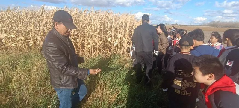 在园区玉米地里,赵良琦老师向同学们介绍了玉米的生长习性和实用价值,并示范给学生如何掰玉米。同学们按照示范,有模有样的劳动起来,学生们分组合作,有序地穿梭在玉米地里,你争我赶,热火朝天,忙的不亦乐乎,不一会儿,一穗穗玉米就堆成了“金山”。
