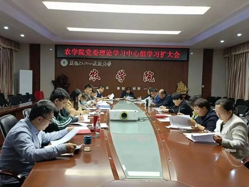 10月30日下午,农学院党委理论学习中心组在学院4001会议室召开学习扩大会,院长郭永霞领学习近平总书记对宣传思想文化工作作出重要指示,副书记、纪委书记王洋领学中央政治局九次会议审议通过《关于进一步推动新时代东北全面振兴取得新突破若干政策措施的意见》和省委十三届四次会议决议,副院长郑雯领学习近平总书记在庆祝中华人民共和国成立74周年招待会上的讲话,副院长杜吉到领学习近平总书记向全国广大农民和工作在“三农”战线上的同志们的祝贺和问候。学院全体党支部书记列席会议参加学习。