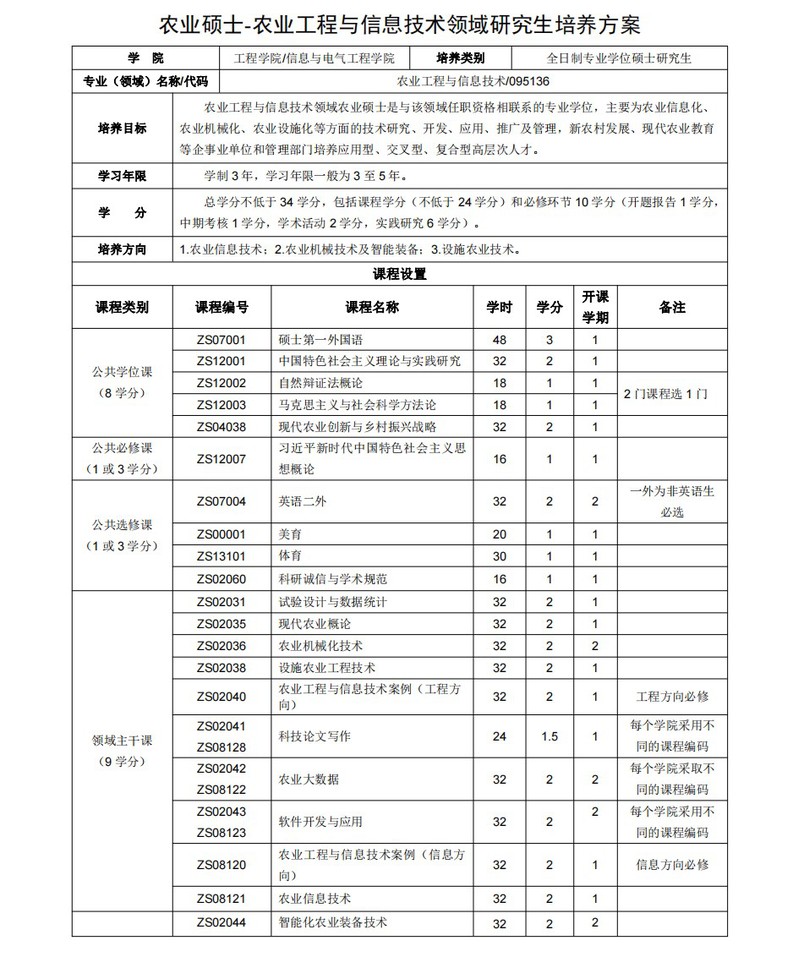 农业硕士-农业工程与信息技术领域研究生培养方案