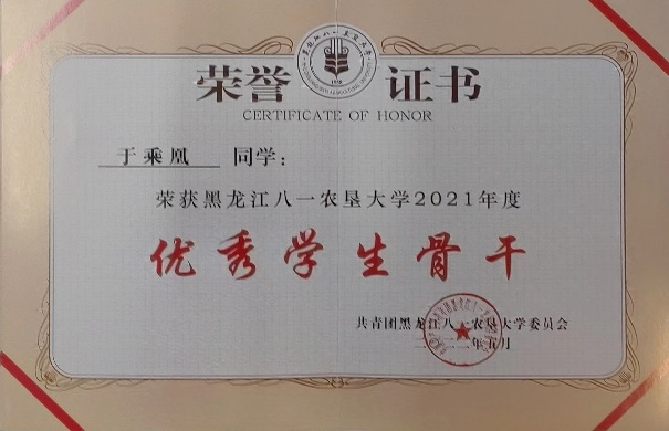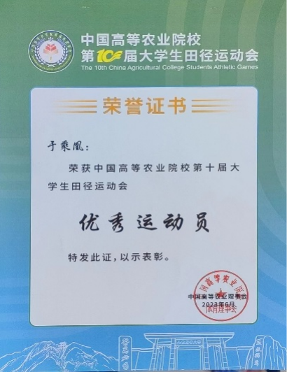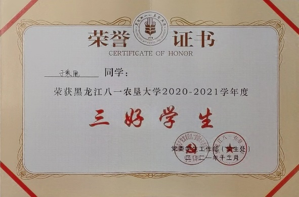 校十佳大学生、省三好学生、 三好学生、优秀共青团员、优秀志愿者、优秀学生骨干、优秀运动员、卓越运动员、文体活动突出贡献奖;国家奖学金、国家励志奖学金;一等综合奖学金、二等综合奖学金、三等综合奖学金;“建行杯”第八届黑龙江省“互联网+”大学生创新创业大赛铜奖;第21届全国大学生田径锦标赛男甲110米栏第五名;中国高等农业院校第十届大学生运动会男乙400栏、110米栏双季军;黑龙江省第18届大学生运动会男甲400米栏、110米栏双冠军;两次打破校运会男400米栏记录。