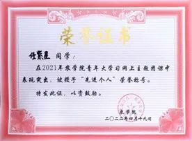 在参加大庆市青少年庆祝建党100周年文艺作品征集评选系列活动中,荣获“优秀表演奖”。在校疫情期间,曾多次参加疫苗接种及核酸检测等志愿活动,在本科期间积极参与本校研究生课题组的实习实践工作,在安达农业科技园的参观与实践工作,深化了自己知农爱农的价值塑造与情怀价值。 在参与大创项目可行性分析与经济效益评价课程中取得优秀成绩,与团队参加“互联网+”大赛获得银奖。