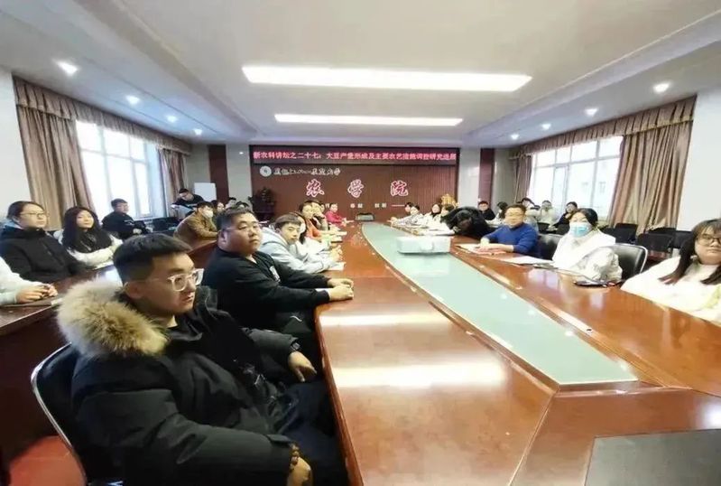 1227日下午,新农科讲坛第二十七讲在农学院4001会议室举行,报告会采用线上+线下结合的形式开展。本次新农科讲坛邀请作物系教师金喜军做相关报告,报告会由农学院科研副院长杜吉到主持,学院相关领域教师和研究生60余人线下参加此次会议,黑龙江省大豆产业技术体系相关专家、农场技术人员100余人通过腾讯会议线上参加了本次报告会。
