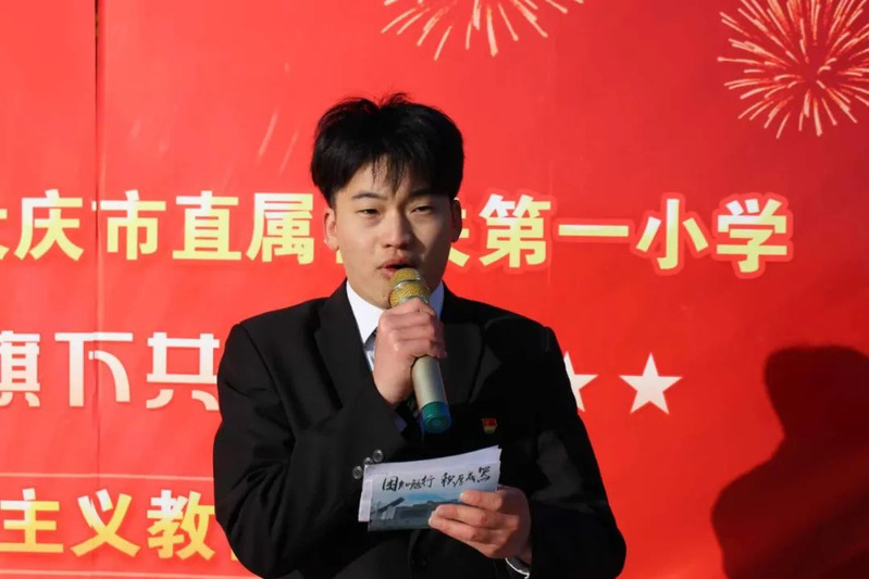 农学院学生代表2023级农业资源与环境三班侯佳慧、退役士兵2022级作物学硕士研究生孟宪喆、机关一小学生代表孙皓轩、阚若文,进行诗朗诵《心向国旗 强国有我》,表达了广大少年、青年,立志成才、永远听党话、跟党走、报效祖国的雄心壮志和理想情怀。最后,在全场嘹亮的“歌唱祖国”合唱声中,此次活动圆满落下帷幕。