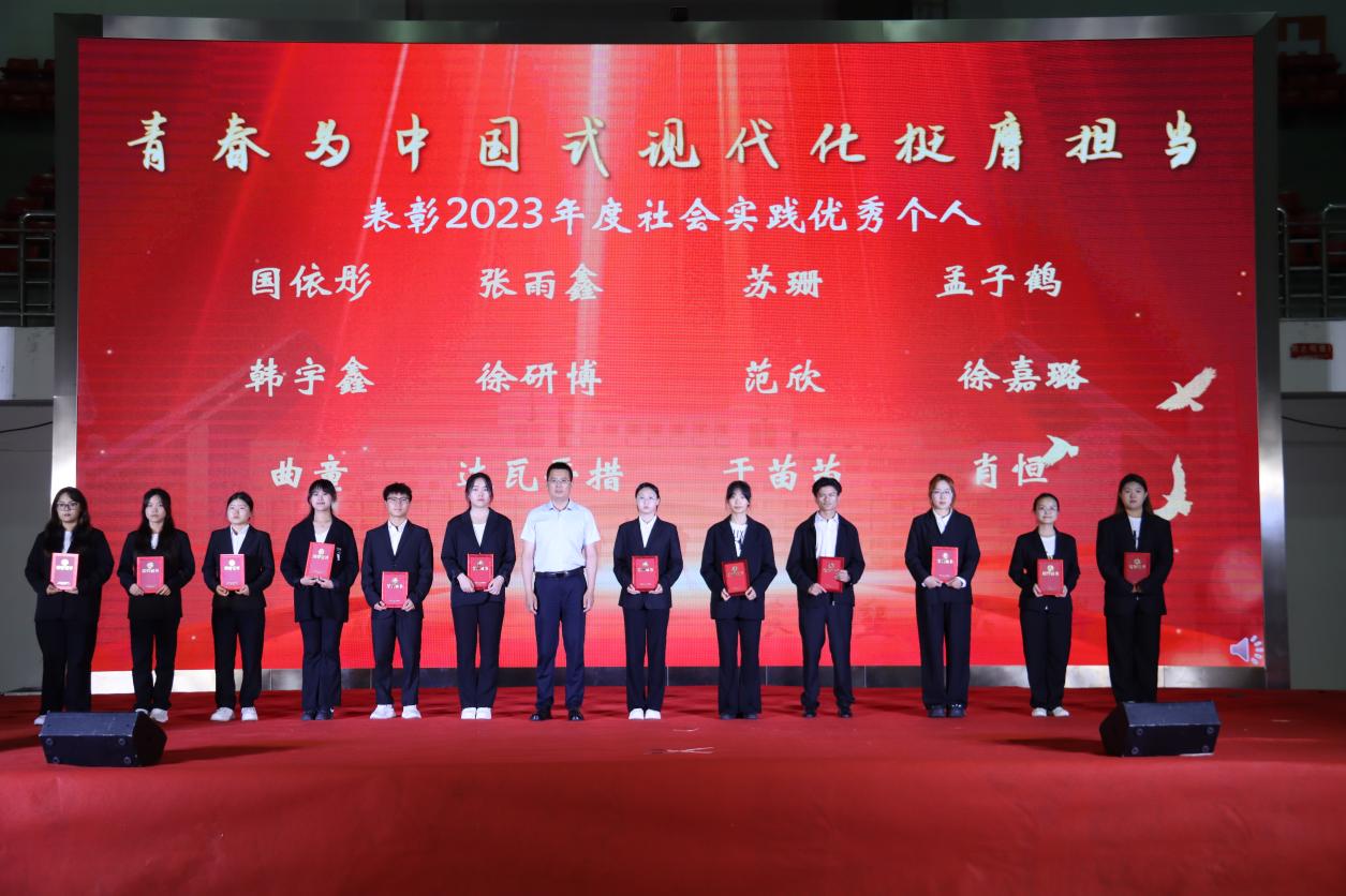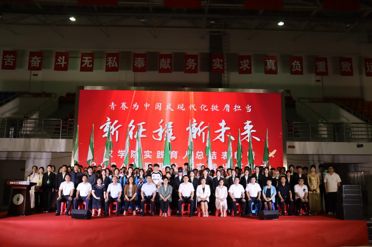 为更好总结学院实践育人工作经验,持续提升实践育人成效,培养学生实践应用能力,7月7日晚,学院在体育馆召开了实践育人总结表彰暨2024年暑期社会实践出征仪式,学院党委书记姜楠、院长郭永霞、校团委书记赵玥、教务处副处长杨树果、招生就业处副处长齐星炜、院党委副书记王洋、副院长孙丽芳、副院长张明聪、班主任代表、全体辅导员及本科全体在校生参加本次表彰大会。