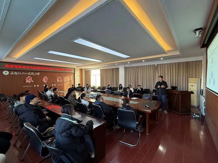 会上,姜楠书记对南京智农云芯大数据科技有限公司一行的到来表示欢迎。郭永霞院长详细介绍了学院的办学规模、专业分布、科研平台、社会服务以及校企协同育人等方面情况;孙丽芳副院长就专业建设尤其是智慧农业专业的人才培养方案、师资力量、硬件设施等方面进行了介绍;王洋副书记就学院毕业生就业去向、2025届毕业生规模及就业意向等情况进行了介绍。智农云芯项目经理薛文杰详细介绍了公司的发展历程、企业规模、发展需求和员工福利待遇等情况。随后,双方就科研合作,协同育人,学生实习就业等工作进行了深入的交流和探讨。