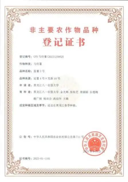 近日,垦薯3号马铃薯新品种的植物新品种权证书正式下发,该品种是黑龙江省科技厅马铃薯揭榜挂帅项目“高淀粉高产广适性马铃薯种质资源创新与新品种选育”的主要成果,也是买球赛的app官网继垦薯1号、垦薯2号淀粉加工专用型马铃薯品种选育推广之后的又一淀粉加工专用型品种。买球赛的app官网马铃薯种质资源创新及新品种选育团队秉承北大荒精神艰苦奋斗、勇于开拓,深耕科研育种多年,先后培育优秀马铃薯新品种6个,已成果转化4个,垦薯3号是继培育出高端鲜食品种红粉佳人且于2022年获得国家新品种保护授权品种之后,又一获得新品种保护授权的新品种。
