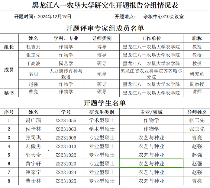 本次开题报告会由黑龙江八一农垦大学杜吉到教授担任开题评委主席,黑龙江省农业科学院齐齐哈尔分院袁明研究员、黑龙江八一农垦大学张玉先教授、于高波教授、赵强副教授担任委员,报告会会由张玉先教授主持,曹亮讲师担任秘书。