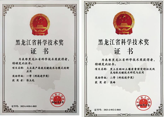 2024 年,张玉先教授团队的《大豆高产高效关键技术与模式创新应用》参与获得黑龙江省科学技术奖“一等奖(科技进步奖)”。焦峰教授团队的《黑土区稻田土壤质量演变特征及改良培肥关键技术研究与应用》参与获得黑龙江省科学技术奖“二等奖(科技进步奖)”。