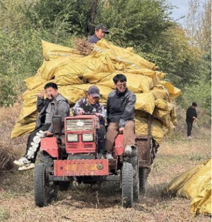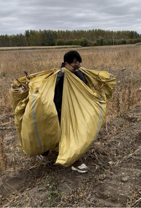 十月份,割完豆子,为防止在地里丢失,全部打包带走,一个个小伙们干劲十足,恨不得一次全给搬出去。