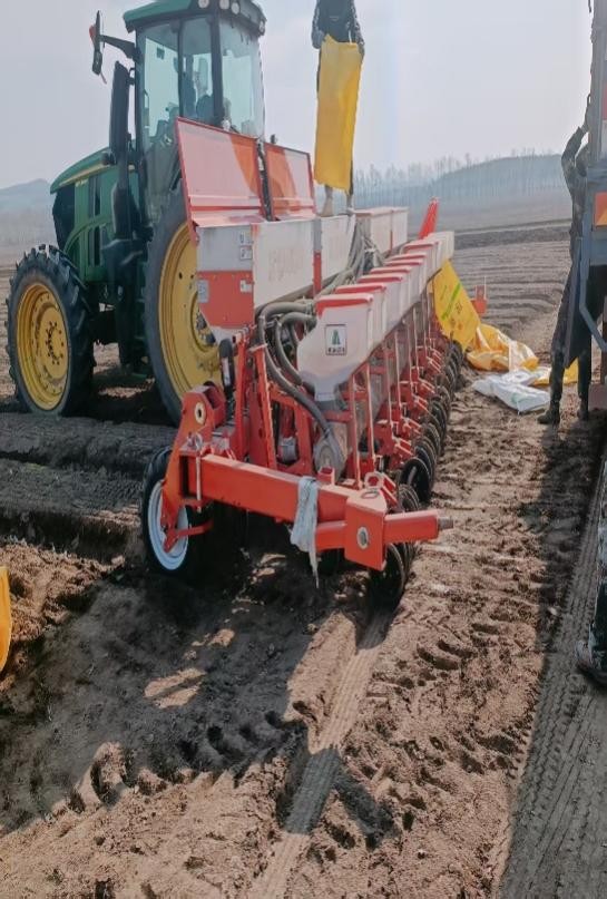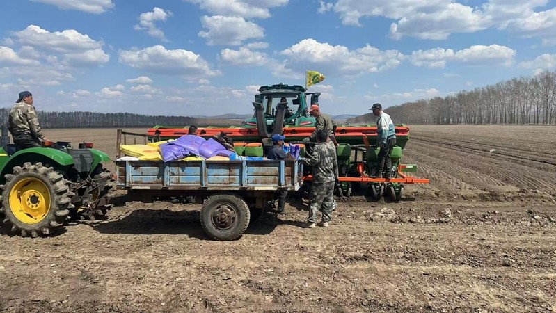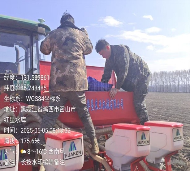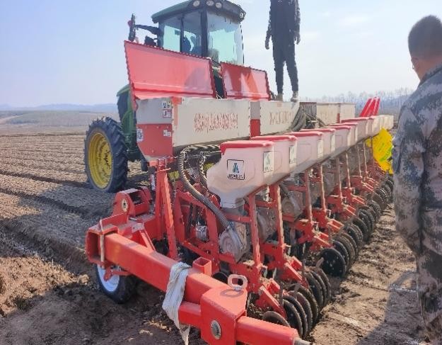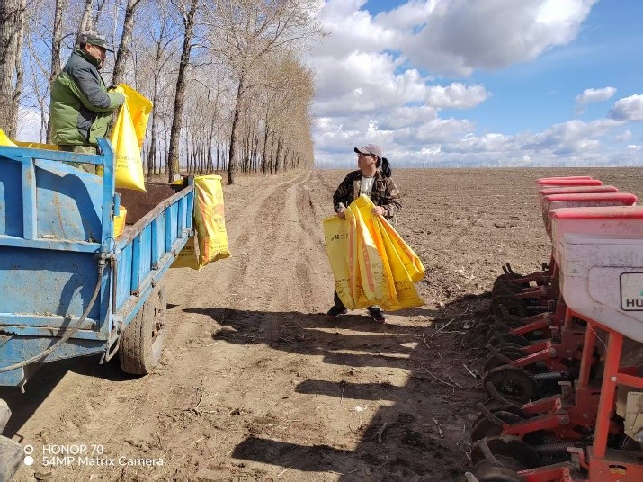 (4)实习期间,我在二十六连队的田间观察、参与和学习了大豆种子的播种工作。855播种的主要大豆品种为垦农34,在专业农技人员的悉心指导下,我系统掌握了此次播种工作中的关键要点:不仅了解了所用化肥的具体类型和特性,明确了适宜本地土壤和气候条件的大豆种子品种,还通过实地操作,精准把握了合理的种距、播种深度等技术参数。并且我亲身参与了大豆种子和化肥的搬运、添加工作了,体会实际劳动。在播种工作中,主要工作是协助农民为播种机添加种子和化肥,整理化肥袋和种子袋,依旧在播种机播种后覆土踩实。
