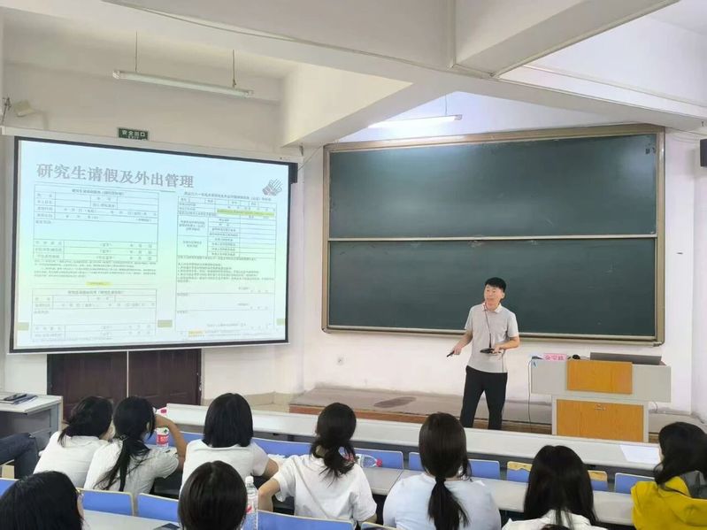 最后,金宝栋老师从多维度为新生开展指导:解读研究生日常管理制度,明确日常行为规范;介绍奖助体系,说明各类奖项的申请条件与评定标准;结合农业领域不同职业特点,提供职业生涯规划建议,鼓励新生积极参与实践活动;同时开展入党启蒙教育,引导新生了解党的宗旨,鼓励有意愿的同学向党组织靠拢,助力新生实现全面成长。